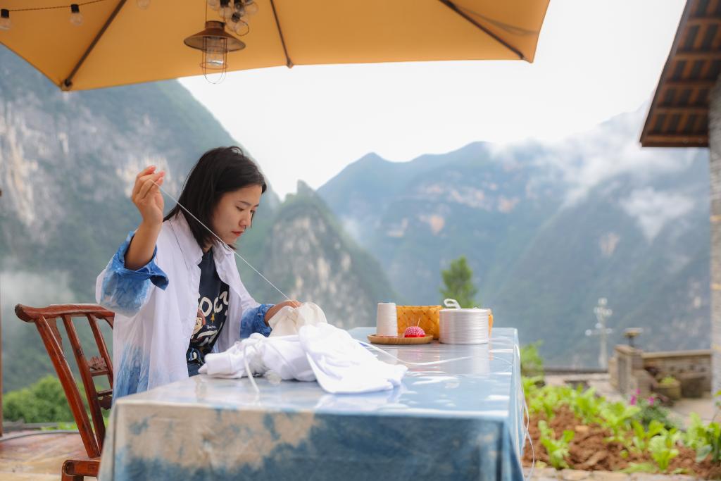 在重庆市巫山县竹贤乡下庄村,“下庄扎染”项目代表性传承人袁孝鑫在创作扎染图案。新华社记者黄伟 摄