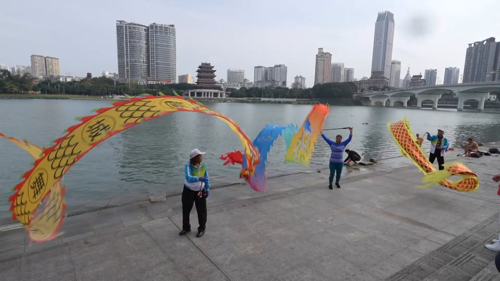 邕江之畔,彩龙飞舞,健身龙爱好者舞动彩龙迎接龙年的到来。