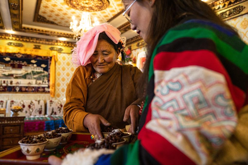2月10日,斯曲旺姆的儿媳妇朗果(左)为家人端上人参果。