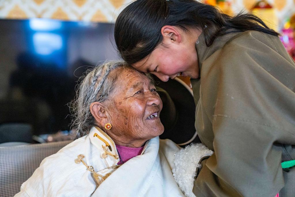 大年初一,斯曲旺姆的儿女们带着各自的小家庭来团聚,百余人的大家庭有几十人回来过年。坐在温暖的家中,斯曲旺姆的孩子们依次献上哈达、敬上青稞酒,被围坐在中间的她希望“这样的日子能久一点,再久一点……”