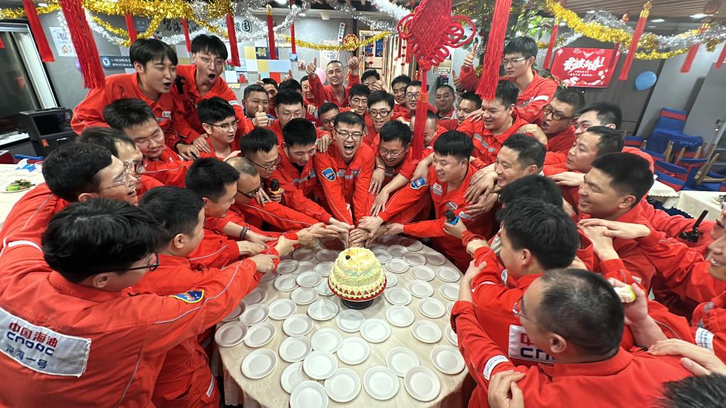 2月9日,“深海一号”大气田员工共同切蛋糕庆新春。新华社发