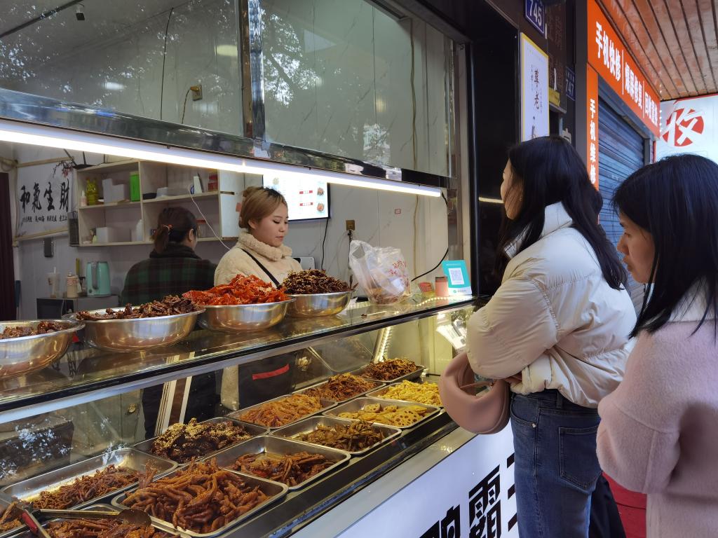 中午时分,卤菜小店“宋记鸭霸王”开门迎客。麻辣肉、碎碎鸭、藕片……展示柜里一盘盘特色小吃色香味俱全,不少行人停下脚步,选购四五样小吃解馋,这是归乡游子“舌尖上的乡愁”。