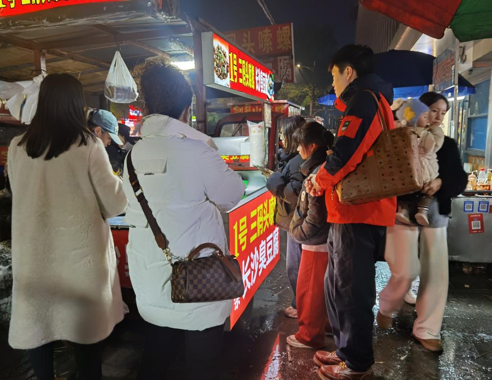 当夜幕降临,路灯和招牌亮起,街心广场聚集了20多个美食摊主,臭豆腐、羊肉串、麻辣烫等摊位上,烟火气在升腾。三五成群的食客围坐在一起,美食刺激味蕾,让人感到“又辣又爽”。