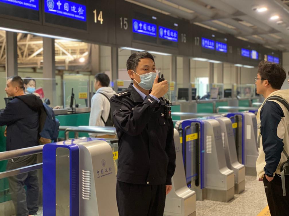 白云边检站执勤八队队长姚宇在口岸指挥调度、严密组织勤务。(白云边检站供图)