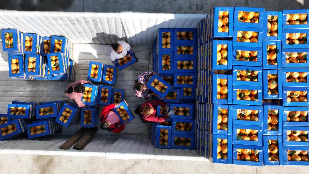 产自贵州岑巩县的思州柚准备发往俄罗斯(2023年11月28日摄)。新华社发(唐鹏摄)