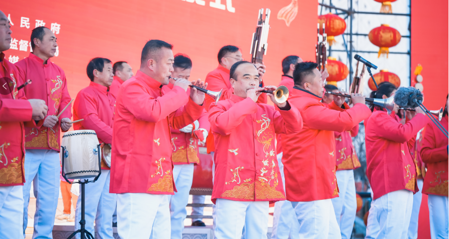 这是山东省嘉祥县的春节乡村文化旅游节活动现场。赵善喜是山东省第六批省级非物质文化遗产——鲁西南鼓吹乐的代表性传承人。