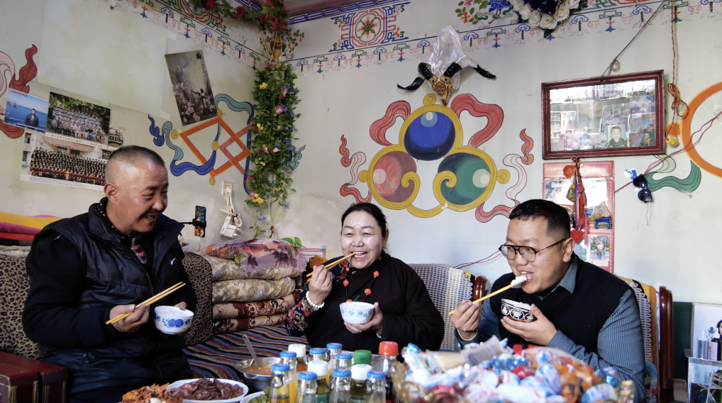 第一道阳光刚在拉萨古城洒落,昂巴康琼大院里的各族群众已经在欢声笑语中庆祝新年——“春节快乐”“罗萨扎西德勒”(注:藏语意为新年吉祥如意)。孙建学和索朗巴珍夫妻俩热情地招待来拜年的邻居,捧上插满五彩谷穗、盛满青稞糌粑,象征着吉祥如意的“切玛”。