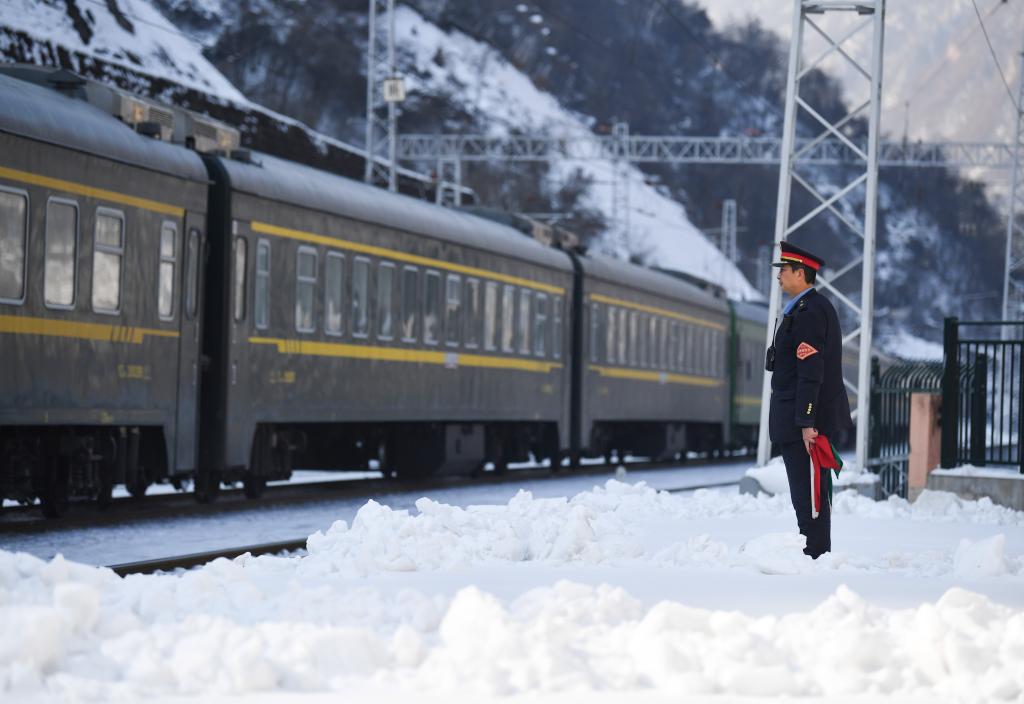 1月28日,在宝成铁路秦岭观音山车站,工作人员在站台引导列车通行。
