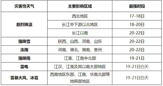 中央气象台预计,2月17日至22日寒潮天气将影响我国,中东部地区气温起伏剧烈,局地气温降幅可达20℃以上。同时,全国大部有明显雨雪天气,其中陕西、山西、河南、山东等地有暴雪,局地大暴雪;南方地区有大范围雷电和局地强对流天气。正值春运返程期间,公众需防范雨雪冰冻天气对交通的不利影响。