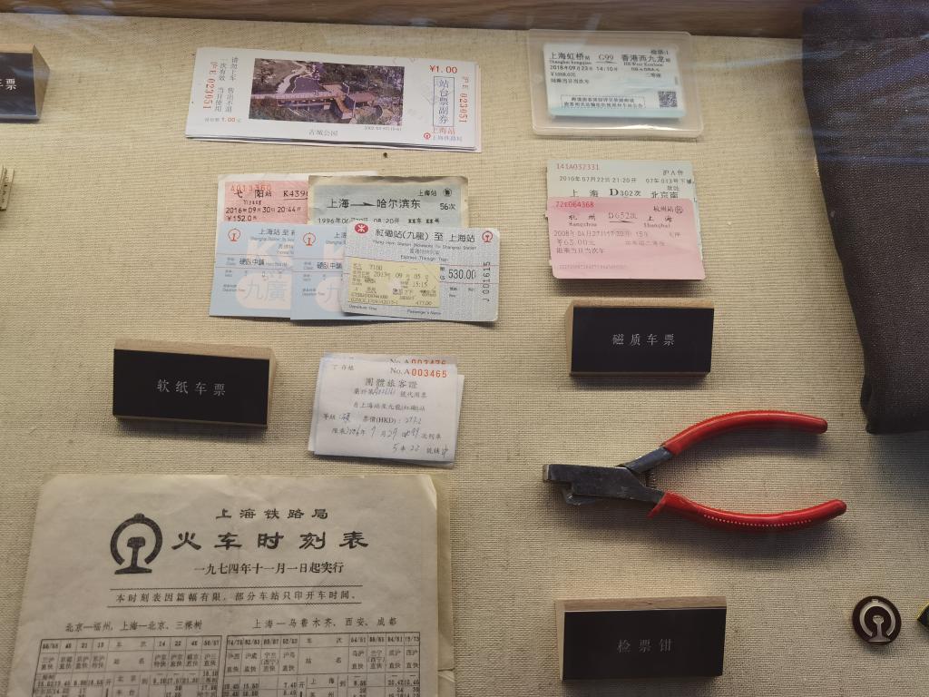 铁路上海站博物馆里收藏的票证、时刻表和检票钳等。新华社发(铁路上海站供图)