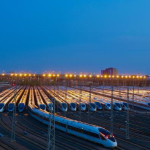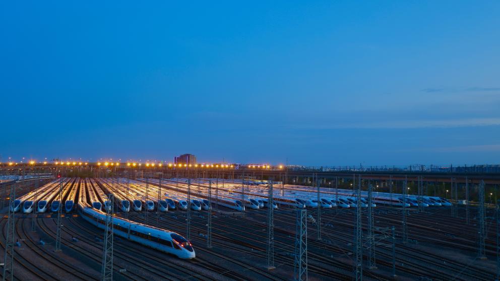 上海虹桥动车所的列车正在陆续发出。新华社发(铁路上海站供图)
