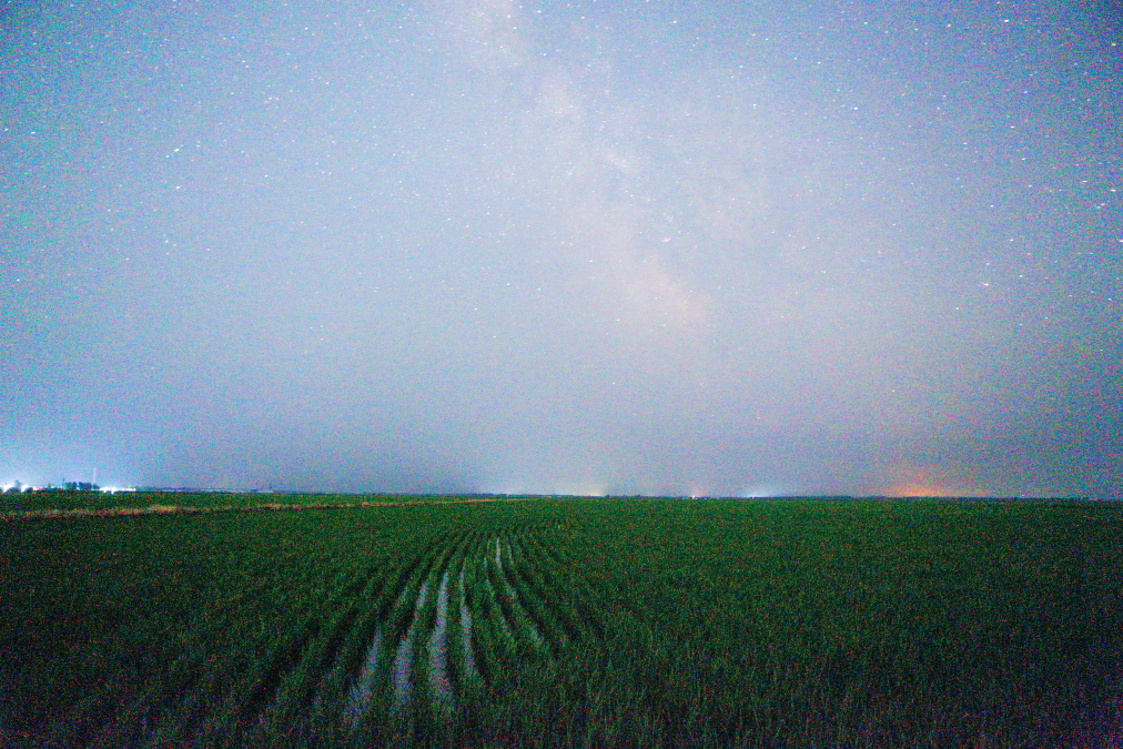 这是2023年6月25日夜晚在黑龙江省富锦市万亩水稻公园内拍摄的稻田和星空。