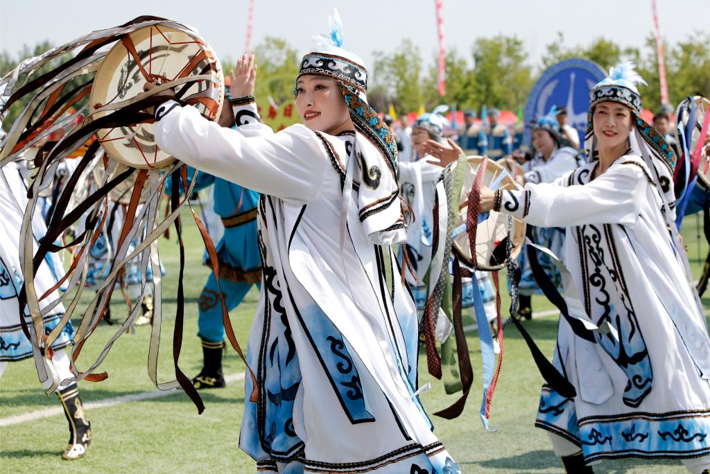 2023年7月2日,在第十一届赫哲族乌日贡大会现场,赫哲族选手身着传统服饰进行表演。