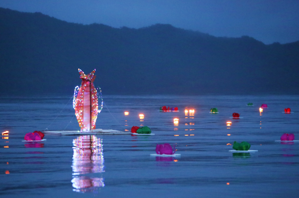 这是2023年8月30日在黑龙江省饶河县四排赫哲族乡第十一届河灯文化节上拍摄的乌苏里江上的河灯。