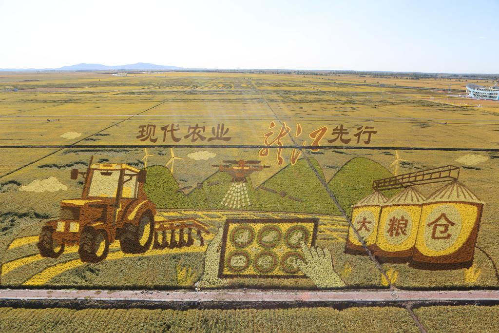 这是2023年9月22日在黑龙江省富锦市万亩水稻科技示范园拍摄的巨型3D稻田画。