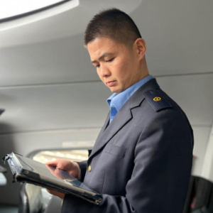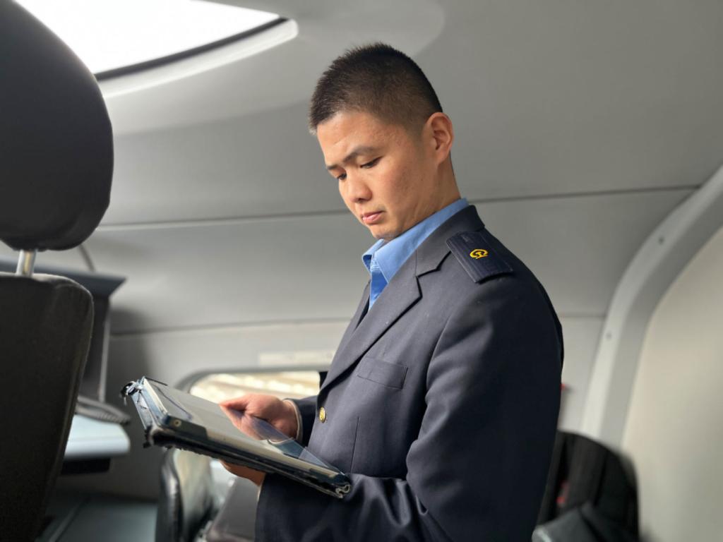 赵玉宝在添乘过程中用平板设备观察问题。新华社记者王怡静 摄。
