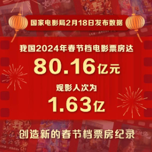 国家电影局2月18日发布数据,我国2024年春节档电影票房达80.16亿元,创造了新的春节档票房纪录,观影人次为1.63亿。