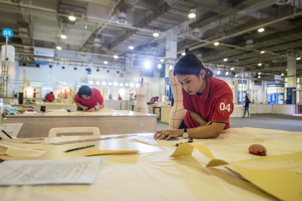 2020年8月16日,在首届浙江技能大赛上,技能人才参加缝纫比赛。新华社记者江汉 摄
