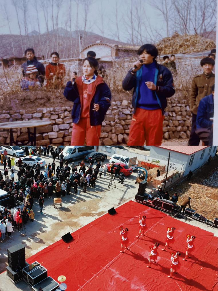 石砖搭起的舞台,状况不断的音响设备,被风刮破的喷绘,丝毫不影响村民们对这台“村晚”的热情。寒风中,他们穿着羽绒服、厚棉袄,时不时为自己的三哥二姨、侄子孙女的表演呐喊、鼓掌。