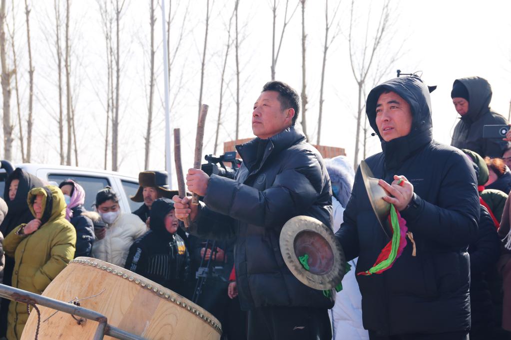 李春军在“村晚”现场敲鼓。(新华社发,张书宁摄)