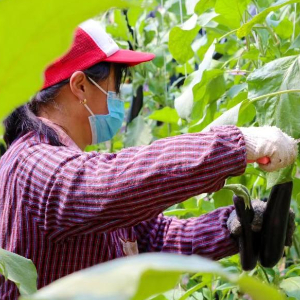 村民正在位于冀州区东罗口村的北京新发地果蔬驿站示范园区采摘茄子。新华社记者任丽颖 摄