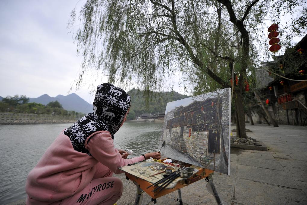 2014年11月8日,一名绘画爱好者在边城镇清水江边写生。