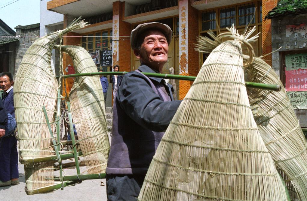 1992年,一名村民挑起自编的鱼笼到茶峒镇(现为边城镇)的集市上出售。