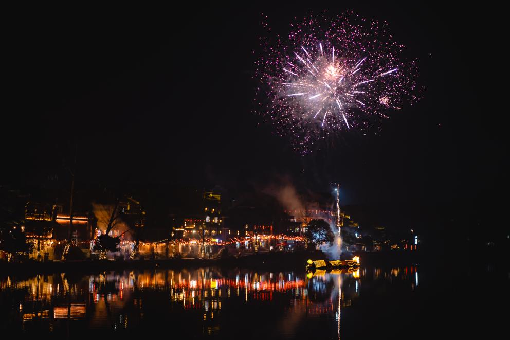 层层叠叠的吊脚楼和酒家灯火倒映在静谧的水面,与拴在渡口码头的几只小船一起微微荡漾。