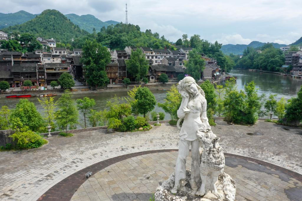 边城的那座白塔已经修复,翠翠和黄狗的塑像矗立在清水江畔,一直守望着桃色暮云、细雨轻烟和潺潺碧水。