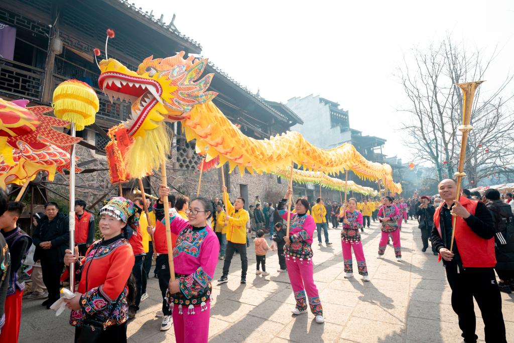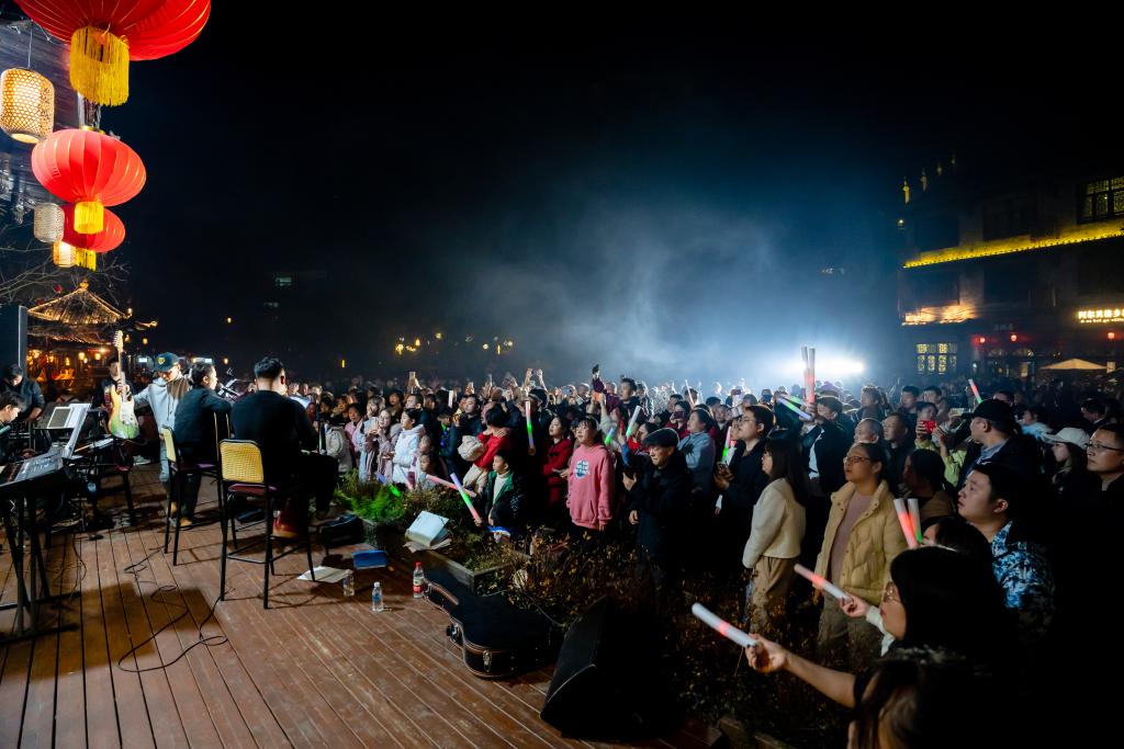 2024年2月14日,游客在边城镇欣赏乐队演出。
