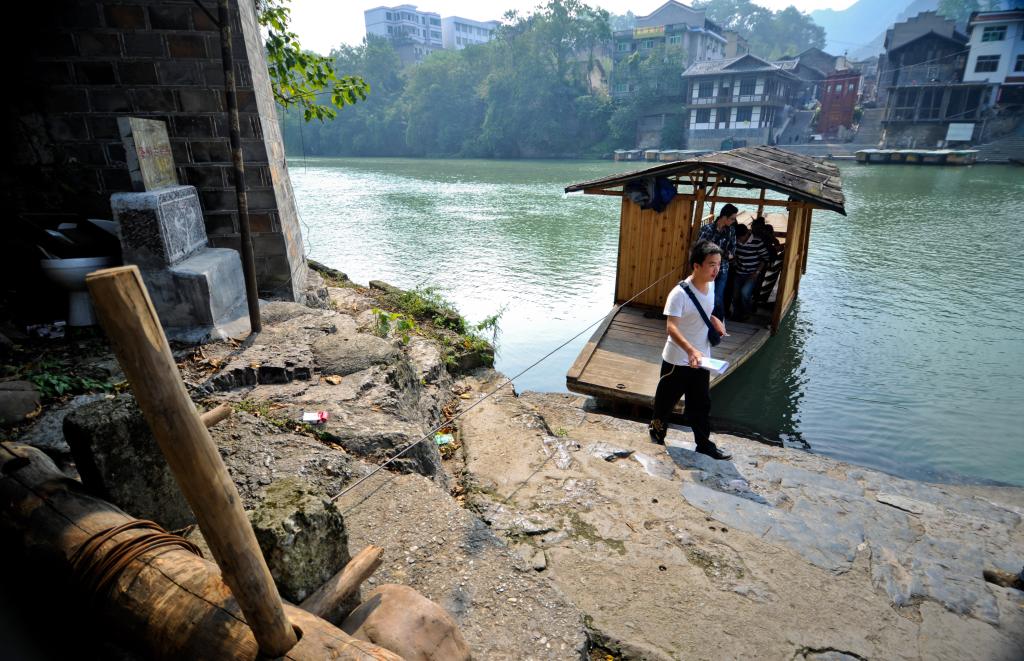 2011年10月10日拍摄的连接湖南边城镇和重庆洪安镇的“拉拉渡”。《边城》中翠翠的爷爷就是茶峒镇“拉拉渡”的船工。“拉拉渡”是湘西一种独特的渡河方式,不靠划桨,不靠撑篙,全凭一只带凹口的木棒在一条贯通两岸的铁丝上一来一回就可以将一船的乘客送达彼岸。