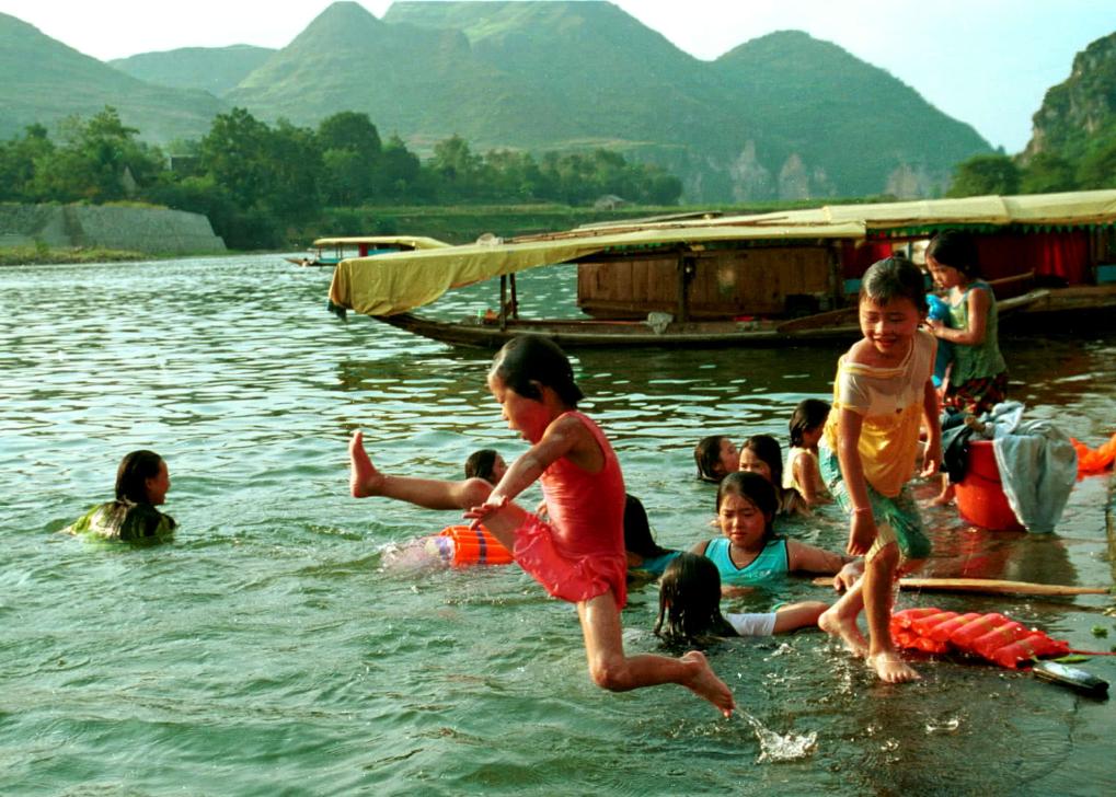 2003年8月15日,一群小朋友在茶峒镇(现为边城镇)的清水江渡口嬉戏。