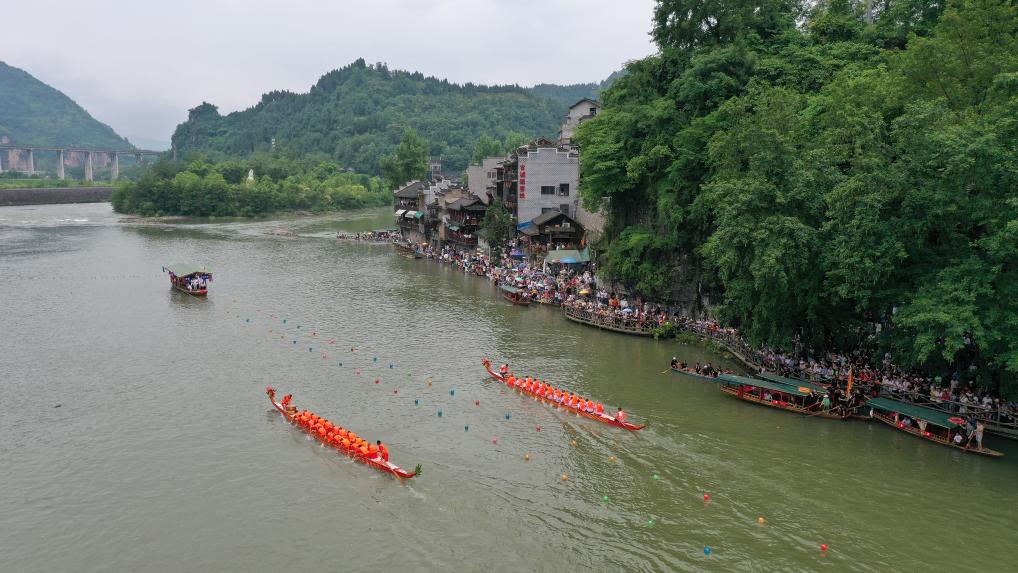 2021年6月12日,人们在边城镇清水江上赛龙舟。