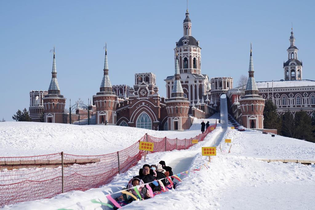 1月3日,游客在哈尔滨冰雪大世界园区内游玩。新华社记者 王建威 摄