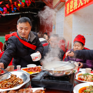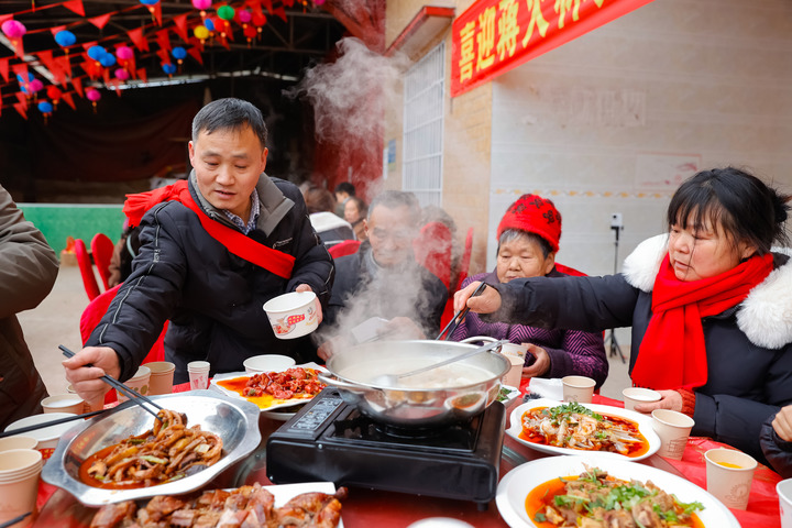 2月2日,蒋光德(前左二)、李秀华(前右二)夫妇、女儿蒋见香(前右一)和儿子刘永旺(原名蒋火林)(前左一)在家中吃坝坝宴庆祝一家人团聚,刘永旺给母亲夹菜。组图均由新华社记者 沈伯韩 摄