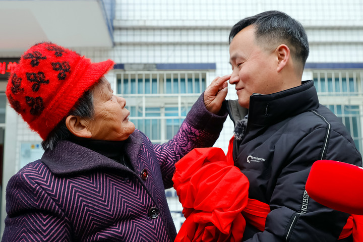 2月2日,在四川省绵阳市三台县新鲁派出所,李秀华(左)抚摸儿子刘永旺(原名蒋火林)鼻子上的疤痕,那是儿子独有的印记。