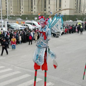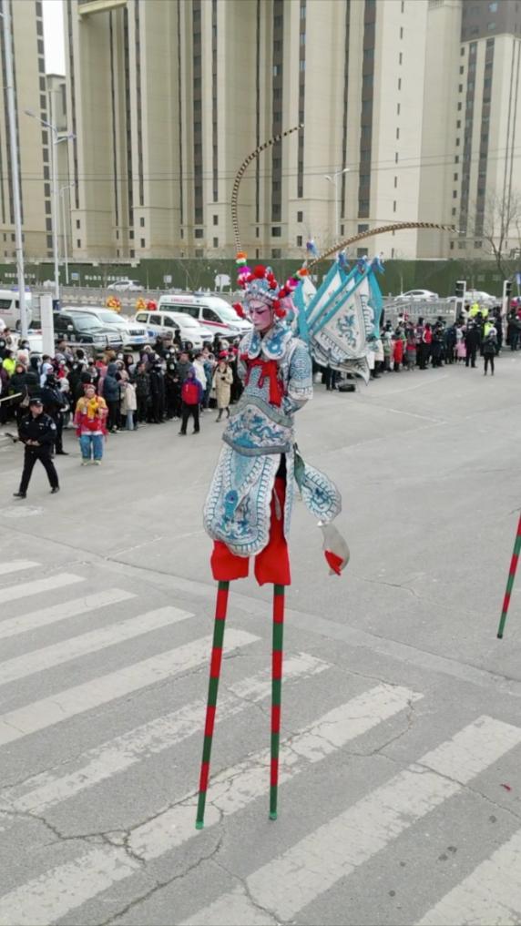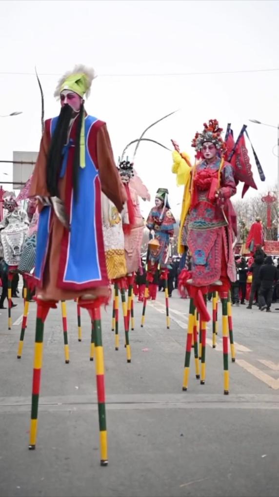在现场,高跷上的演员身穿传统戏服,妆容艳丽,步伐潇洒,仿佛凌空漫步……