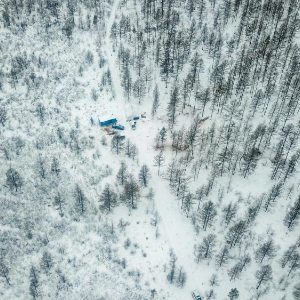 这是2023年1月12日拍摄的驯鹿饲养人在大兴安岭林区深处的临时放牧点(无人机照片)。新华社记者 彭源 摄