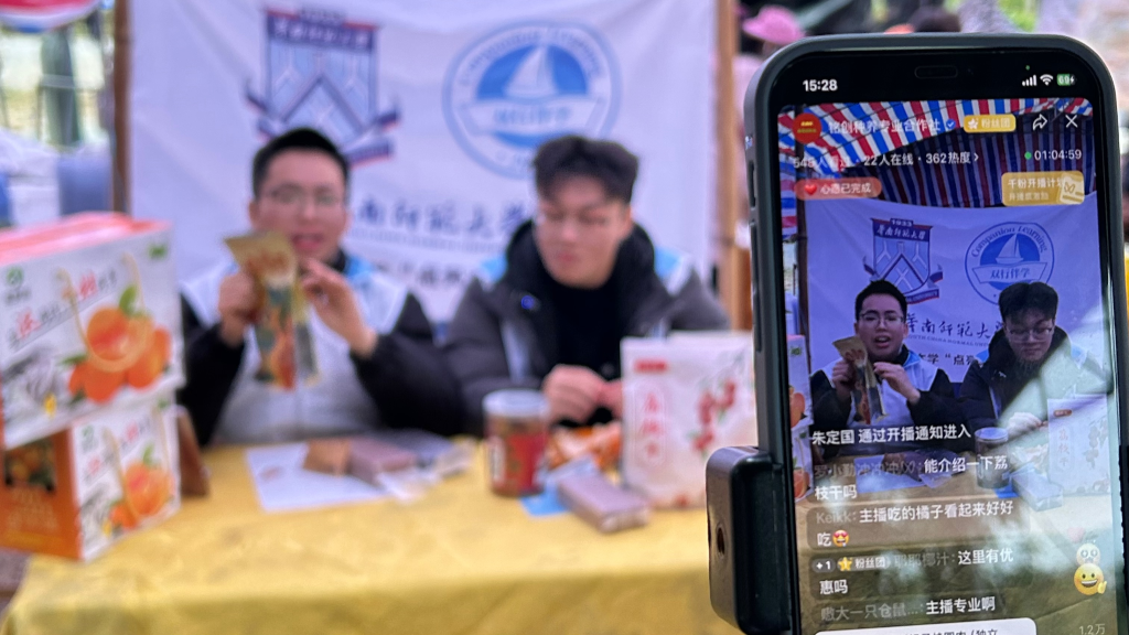 寒假期间,华南师范大学学生在广东茂名信宜市结坡村开展直播带货。(受访者供图)