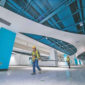 地铁12号线已完成车站及区间主体结构工程。在三元桥站,工人正在进行换乘厅的装修施工。 本报记者 潘之望摄