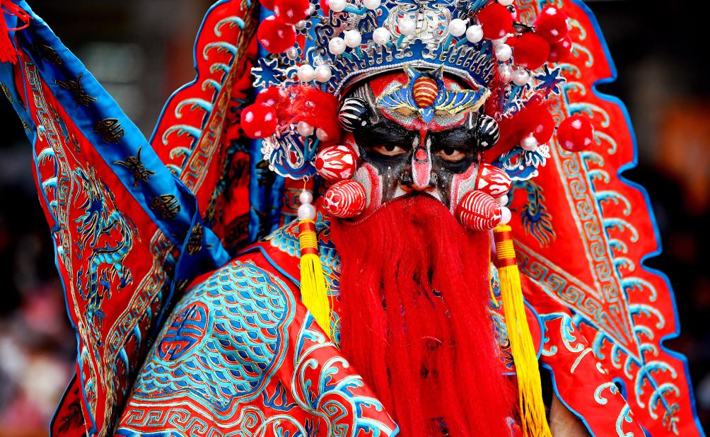 陕西省宝鸡市陇县元宵节社火巡游活动上,社火队成员脸上绘制着当地特色的疙瘩脸谱。新华社记者 刘潇 摄