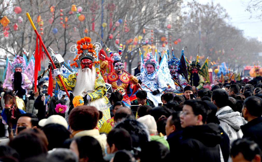 陕西省宝鸡市陇县社火巡游活动上,社火队伍在展示背芯子。新华社记者 刘潇 摄
