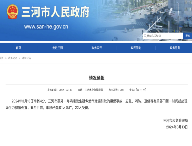 2024年3月13日7时54分,三河市燕郊一炸鸡店发生疑似燃气泄露引发的爆燃事故,应急、消防、卫健等有关部门第一时间赶赴现场全力救援处置。截至目前,事故已造成1人死亡,22人受伤。
