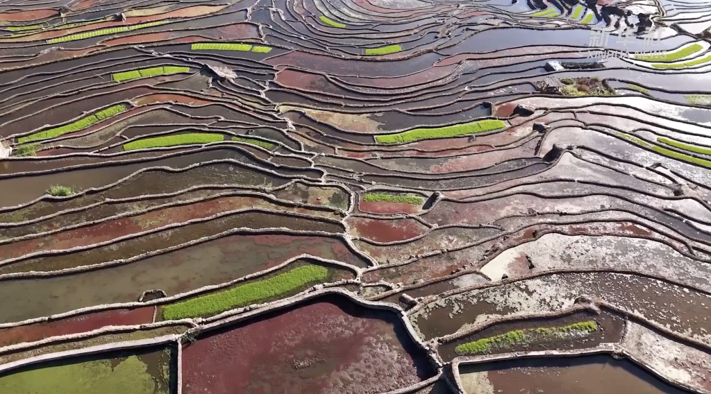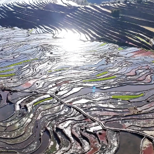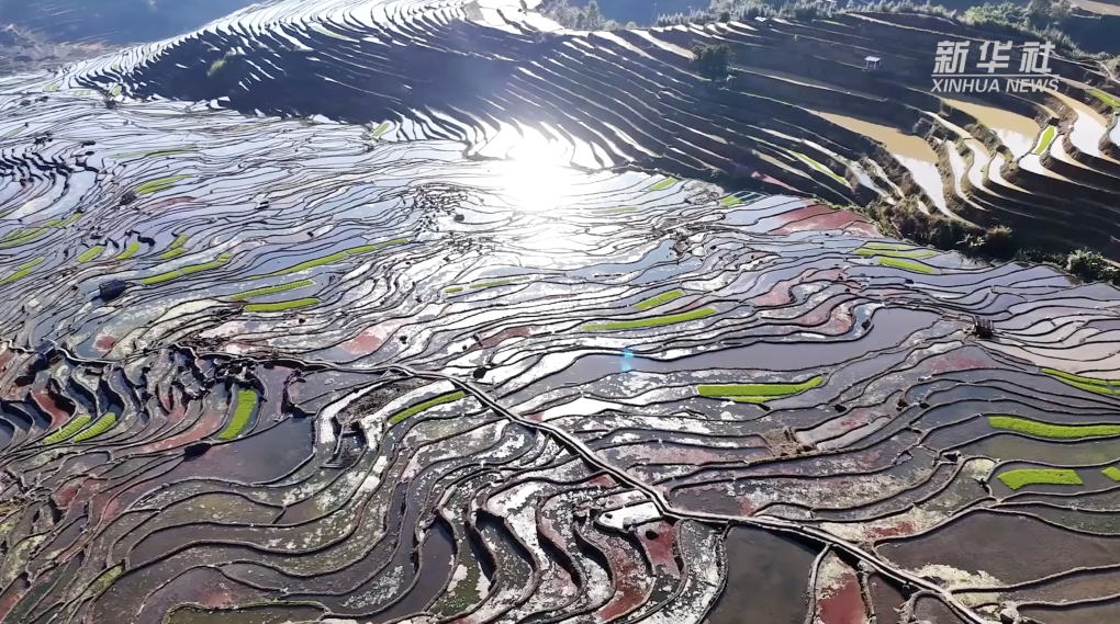 从空中俯瞰哈尼梯田,明镜般的梯田勾勒出一幅美丽的生态画卷。