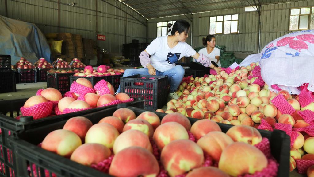 2021年8月9日,在天水市秦安县刘坪镇蜜桃种植基地,农民在一家收购点分拣蜜桃。新华社发(王克贤 摄)