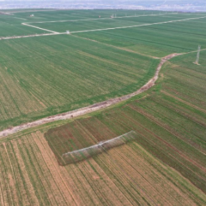 3月6日,在西安市长安区神禾塬万亩优质粮食生产基地,长丰农机专业合作社使用淋灌机浇灌小麦(无人机照片)。新华社记者邵瑞 摄