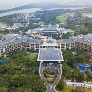 这是在海南省琼海市博鳌镇东屿岛拍摄的博鳌亚洲论坛国际会议中心和博鳌亚洲论坛大酒店(3月9日摄,无人机照片)。
