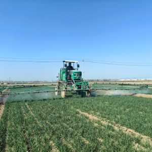 工作人员驾驶自走式喷杆喷雾机在麦田里喷洒除草剂。新华社记者张力元 摄