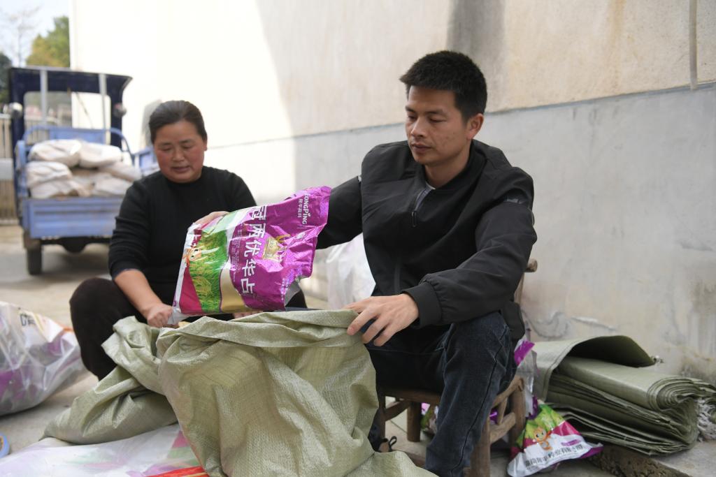 3月21日,在鼎城区谢家铺镇,戴宏(右)在做浸种前的准备工作。(陈欢 摄)