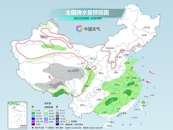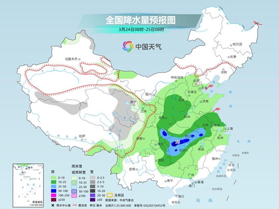 今天(3月24日),我国中东部大范围降水持续,江汉、江南西部等地将成为降雨中心,其中安徽中部、湖北东部和南部、湖南北部和西部等地部分地区有暴雨,并伴有强对流天气,明天上述地区降雨强度将有所减弱。同时,受冷空气影响,中东部大部将自西向东出现明显降温,南方多地气温先升再降,冷暖差异较大。
